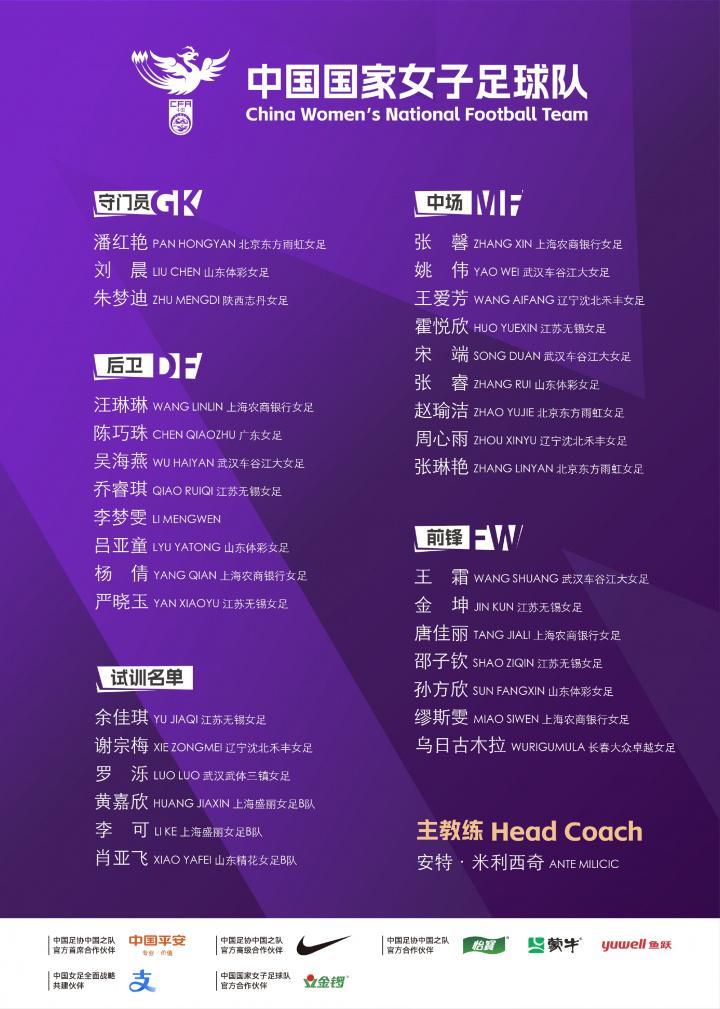 直播吧08月25日讯 中国女足新一期集训大名单,王霜、李梦雯、张琳艳、吴海燕、唐佳丽在列。